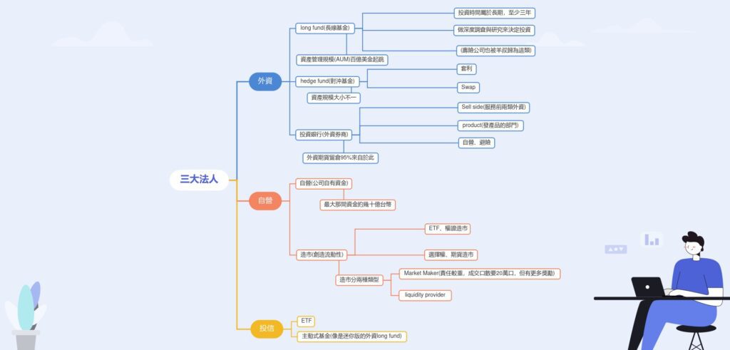 - 外資:國外的投資機構,其中可以分為長線基金、對沖基金,以及投資銀行。