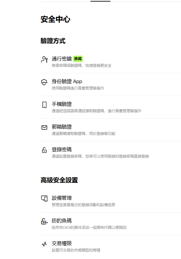 如上圖,OKX有安全中心,可以保障你的帳號安全,請大家記得要去做好相關設定喔!