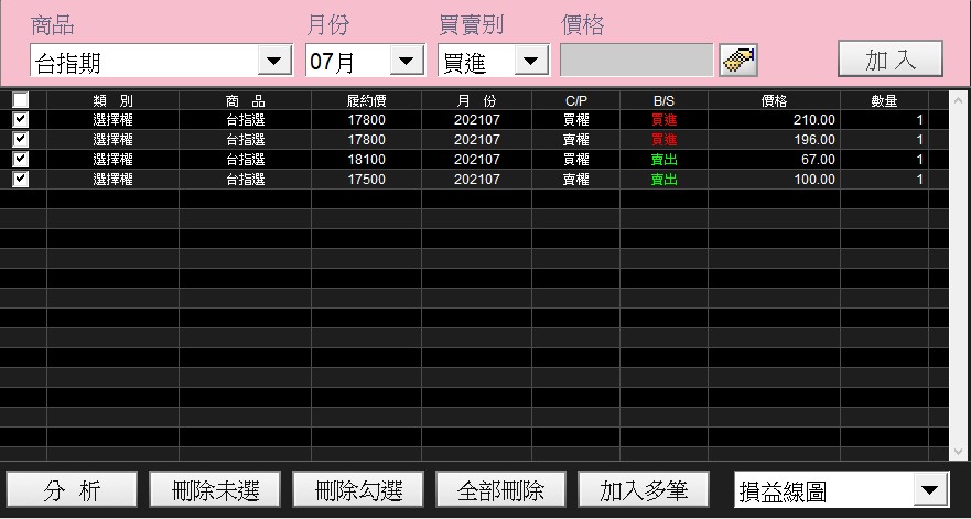 而賣出類型我就不建議去做,一方面前面有說,我認為去封住獲利的發展很矛盾,另一方面,行情並不是常常會發生的,做賣出類型的兀鷹蝴蝶勝率比較低,即使他的成本比單純雙買來的低,也不應該因為它的成本比較便宜就選擇去做。