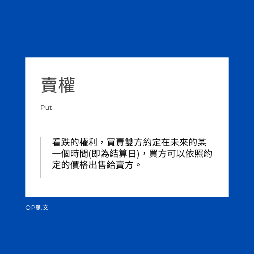 賣權(Put)就是看跌的權利,彼此約定在未來的某一個時刻買方可以用某個價格賣出的權利。